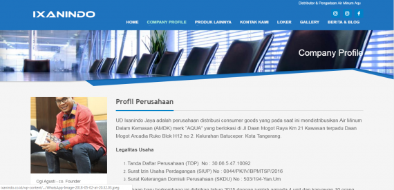 UD Ixanindo Jaya adalah perusahaan distribusi consumer goods yang pada saat ini mendistribusikan Air Minum Dalam Kemasan (AMDK) merk “AQUA” yang berlokasi di Jl Daan Mogot Raya Km 21 Kawasan terpadu Daan Mogot Arcadia Ruko Blok H12 no 2. Kelurahan Batuceper. Kota Tangerang.